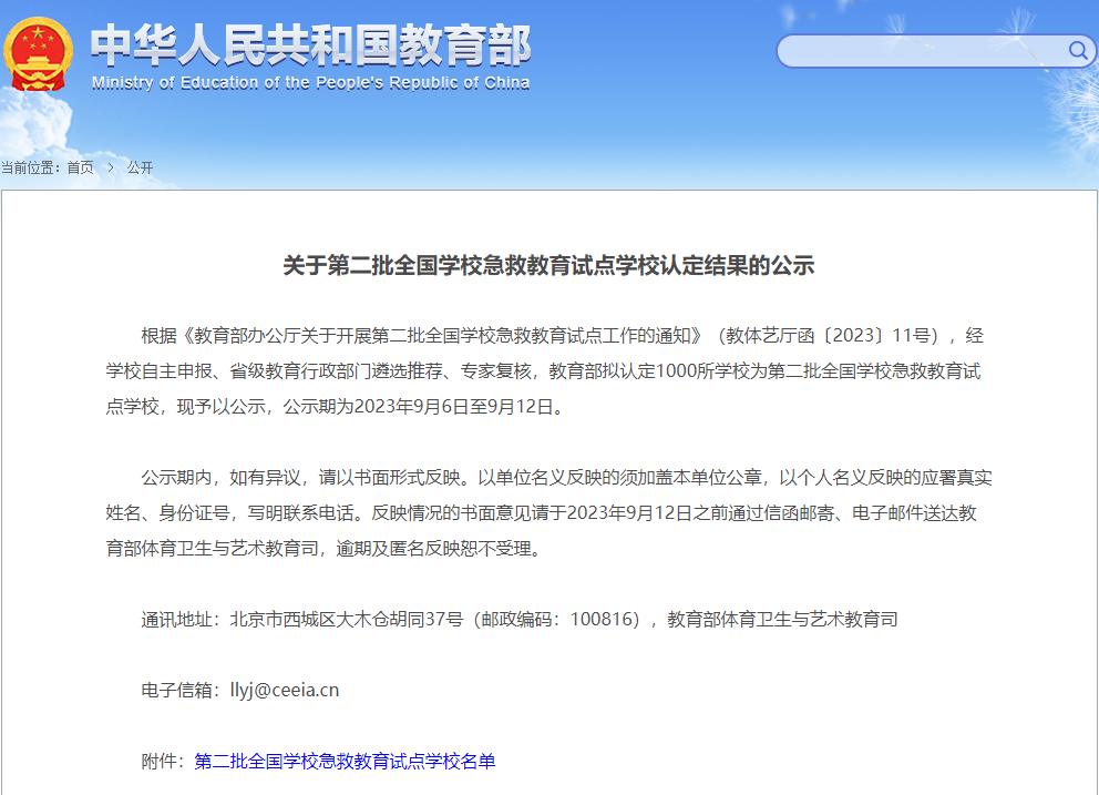 近日,教育部公示第二批全国学校急救教育试点学校认定结果,开云名列其中。
