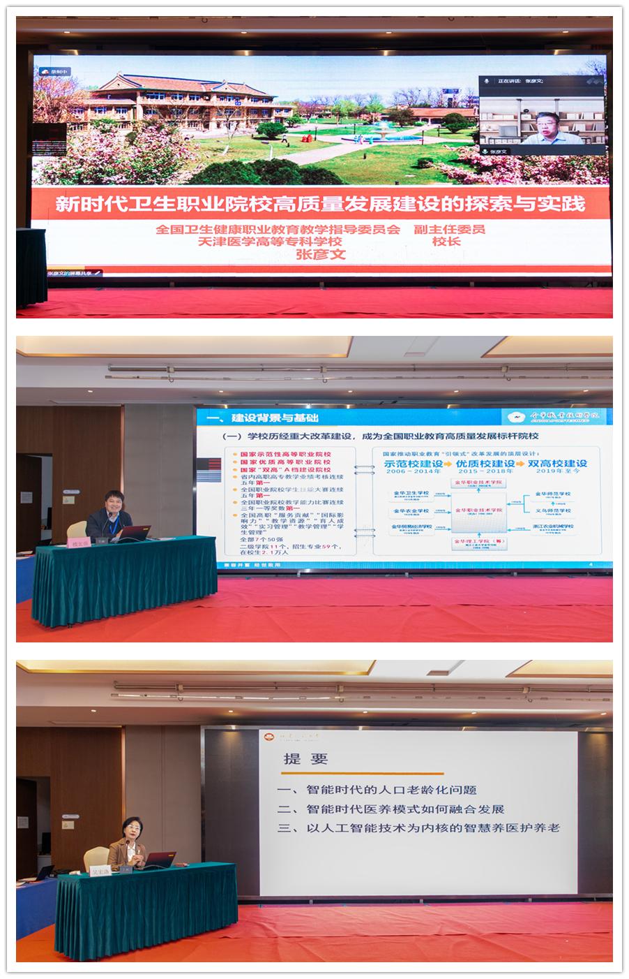 会上,来自省内外医药卫生与健康领域的三位专家教授围绕大会主题进行专题报告。天津医学高等专科学校校长张彦文以《新时代卫生职业院校高质量发展建设的探索与实践》为题,通过现场连线的方式为参会人员开展讲座。他分享了天津医学高等专科学校建设改革目标制定和实施的经验,为全面加强产教融合、校企合作提供高屋建瓴的指导。金华职业技术学院楼宏强教授以《职业教育深入推进产教融合实践探索》为题,从建设背景、基础、思路及举措等层层推进,展开论述。福建师范大学吴宏洛教授以《人工智能时代医养融合发展的养老服务探析》为题,阐述人工智能技术对健康养老产业及人才培养的影响,引发了现场人员的热烈讨论。三位专家的报告深入浅出地阐述了教育强国建设背景下如何通过产教融合实现教育链、人才链与产业链、创新链的有机衔接,干货满满。