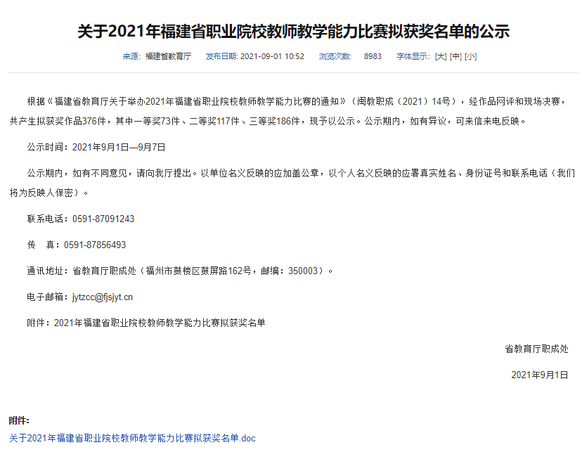 2021年福建省职业院校教师教学能力比赛开云拟获奖名单汇总表