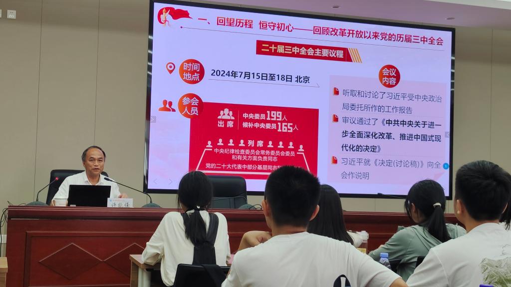 许能锋围绕习近平总书记在党的二十届三中全会上的重要讲话和全会通过的《决定》,对全会的重大意义、《决定》提出的重大改革创新举措和习近平总书记关于全面深化改革的一系列新思想、新观点、新论断四个方面进行了重点解读和细致梳理。