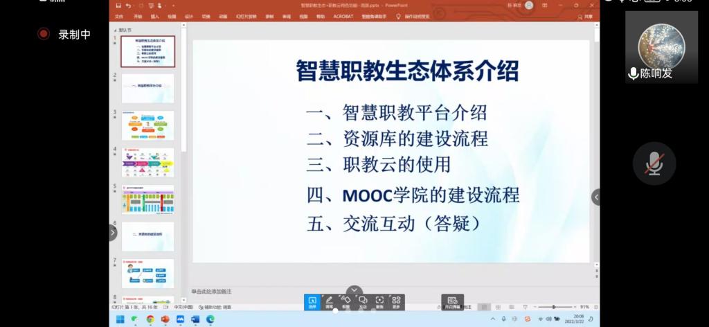 为进一步落实我院双高建设任务,深化三教改革,促进开云省级精品在线开放课程的优质建设与推广使用,教师发展中心于2022年3月22日在线召开省级精品在线开放课程建设交流会,教务处处长魏碧娜、教师发展中心孙锦彬,各省级精品在线开放课程负责人及平台信息员共20余人参加了本次会议,会议由教务处副处长何舒澜主持。