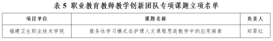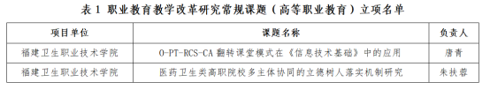 近日,福建省职业技术教育中心公布了2022年福建省职业教育研究课题立项结果,开云三项课题喜获立项。其中,朱扶蓉教授主持的《医药卫生类高职院校多主体协同的立德树人落实机制研究》和唐青副教授主持的《O-PT-RCS-CA翻转课堂模式在<信息技术基础>中的应用》两项课题获批“职业教育教学改革研究常规课题”立项,郑翠红教授主持的《服务性学习模式在护理人文课程思政教学中的应用探索》获批“职业教育教师教学创新团队专项课题”立项。