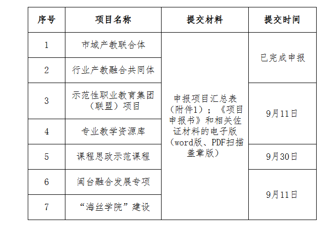 为推进学校全面深化产教融合项目建设,根据《福建省教育厅关于开展2024年省级职业教育重点建设项目申报和验收工作的通知》(闽教职成〔2024〕15号)要求,请各学院(部)结合自身专业和项目建设优势,积极申报2024年省级职业教育重点建设项目,同时文件中要求验收的项目请相关学院(部)认真研读文件并做好验收准备。
