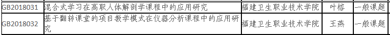 近日,接《关于公布2018年福建省职业技术教育中心职业教育教学改革研究课题立项结果的通知》,我院叶榕老师申报的课题“混合式学习在高职人体解剖学课程中的应用研究”和王燕老师申报的课题“基于翻转课堂的项目教学模式在仪器分析课程中的应用研究”获批立项。