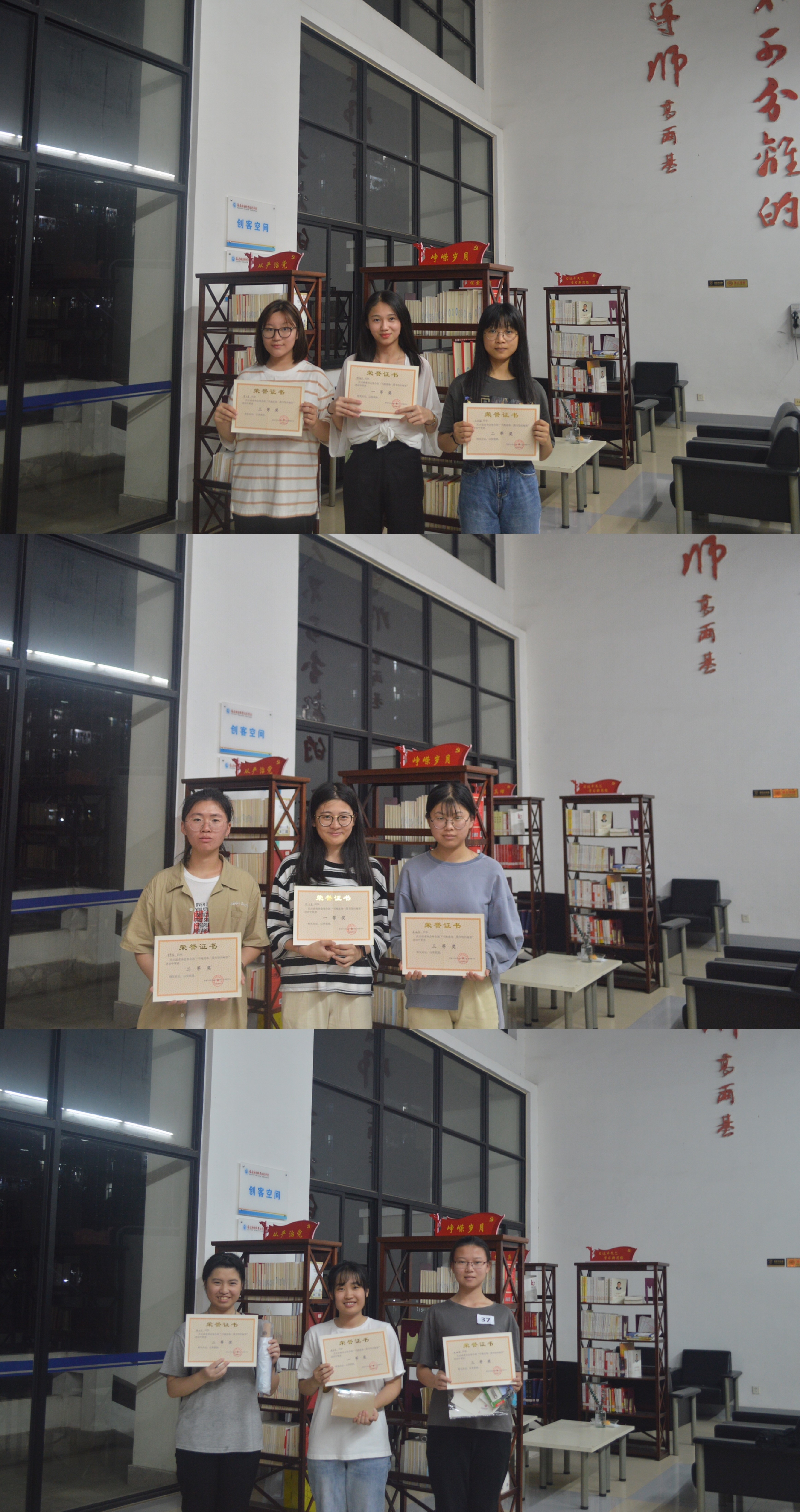 本次大赛吸引了近百名同学参加,分为三组,分别是勤工俭学组、读者协会组、学生组。经过激烈的竞争,最终勤工俭学组17药学304杨福来获得一等奖,18影像303朱丽敏获得二等奖,18药学301梁玉茜获得三等奖,读者协会组18检验304蔡诗盈获得一等奖,18口腔301曾梦媛获得二等奖,18护理314薛晓悦获得三等奖。学生组18临床302邓佳凤获得一等奖,18护理318陈禾昀获得二等奖,18药学307赵涵影获得三等奖。