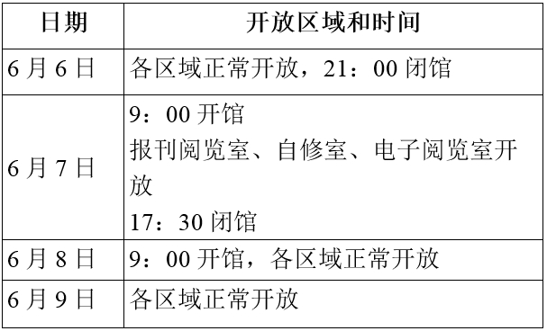 月7日至6月9日,放假期间,图书馆开放时间调整如下: