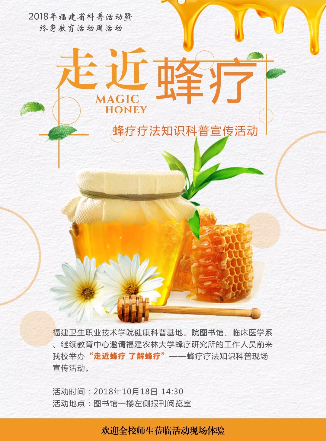 2018年10月18日,图书馆、临床医学系、继续教育中心将邀请福建农林大学蜂疗研究所的工作人员前来开云举办“走近蜂疗 了解蜂疗”——蜂疗疗法知识科普现场宣传活动 ,欢迎全院师生参与。