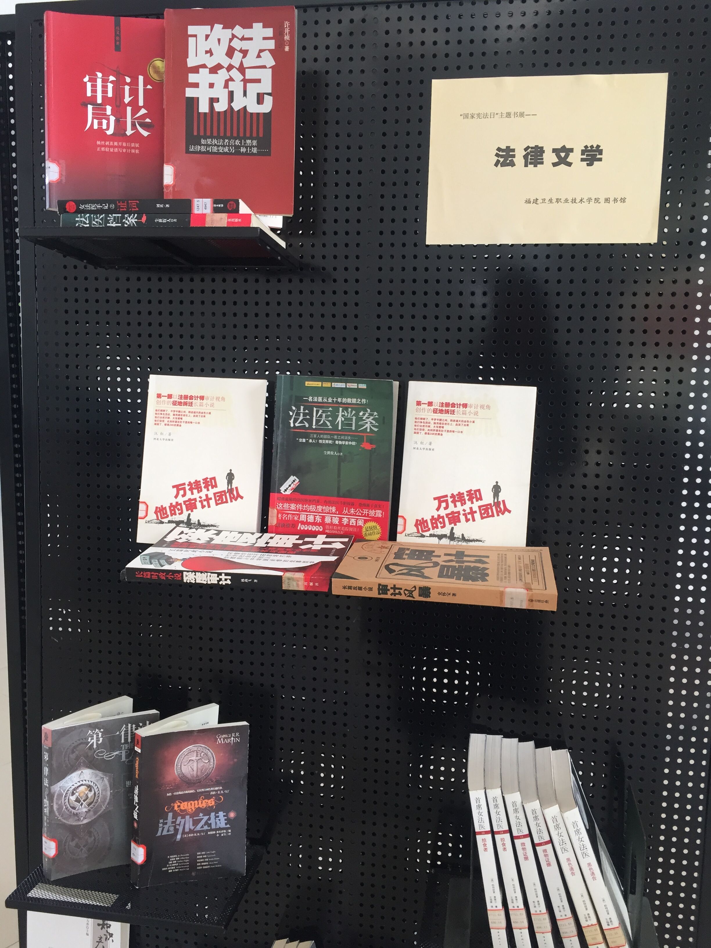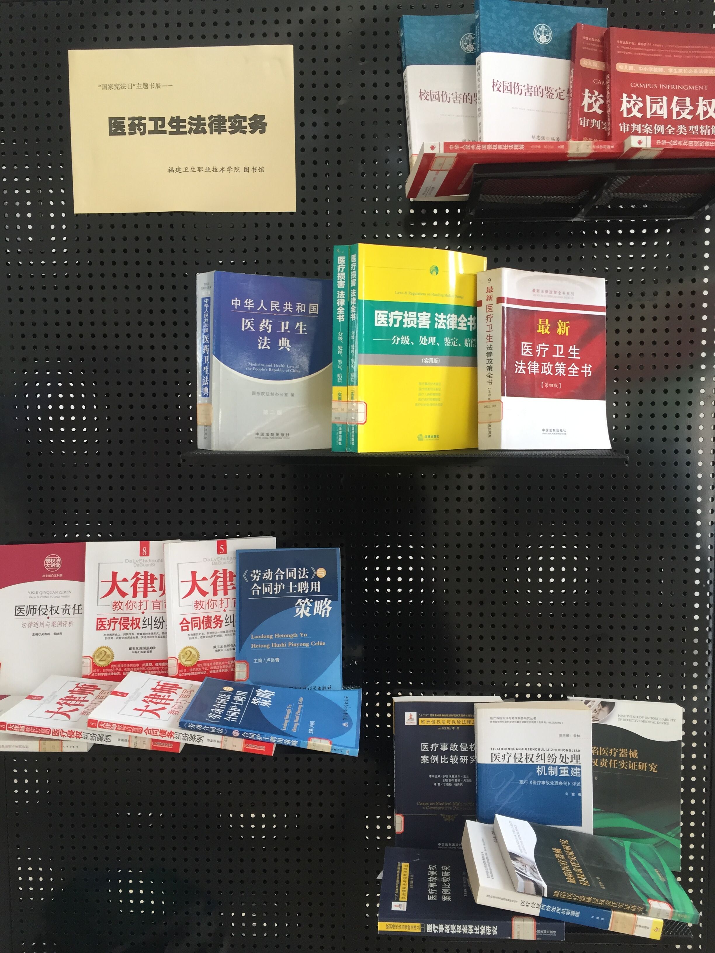 此次书展共展出宪法、法律人文与历史、法律文学、医药卫生法律实务、教育法律等类别图书一百余册,内容丰富,旨在加强我院师生的法律常识教育,增强其自我保护意识和法制观念,提高师生法律素质和思想道德素养,欢迎广大师生前来借阅。
