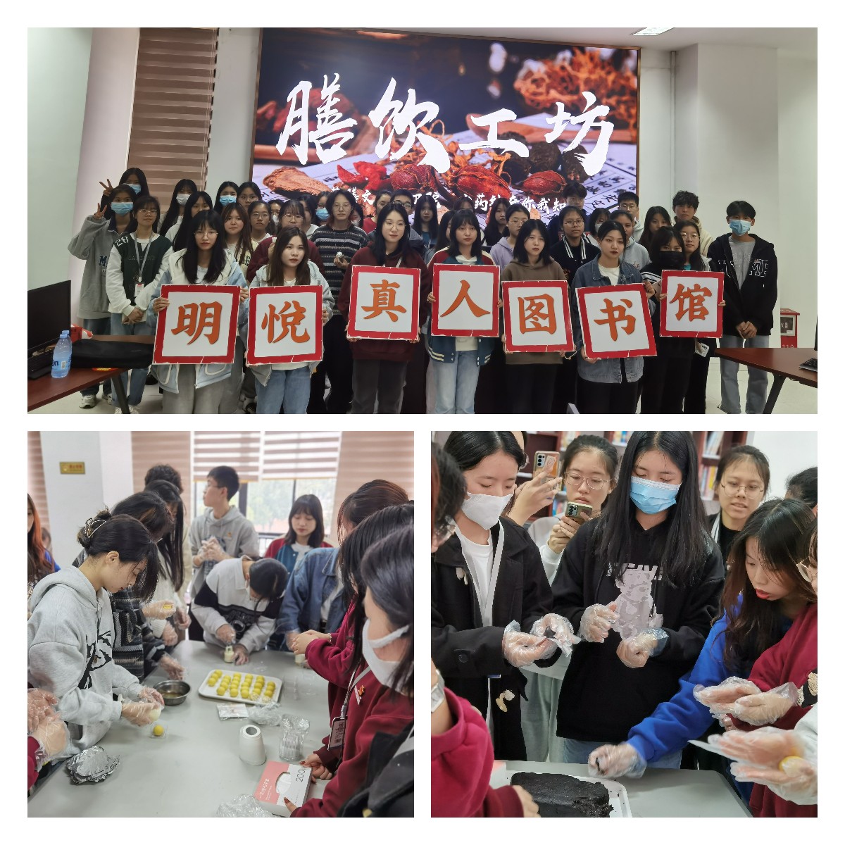 首先,主讲嘉宾介绍了膳饮工坊团队的建立背景和近些年团队的发展情况。接着,主讲人图文并茂,向大家简要介绍了一些中医养生文化知识,如常见的药膳、药茶、中药香囊及相关的保健作用等。接下来就进入到本次活动最令人期待的环节:参与读者在观看了制作视频后,在膳饮工坊团队工作人员的指导下,亲自动手用事先准备好的原材料做出了一个个美味的绿豆糕,搓出了一粒粒饱满的黑芝麻丸。活动尾声,膳饮工坊的工作人员通过趣味知识问答环节为参与答题的同学们发放了纪念品。至此,本期真人图书馆活动圆满结束。