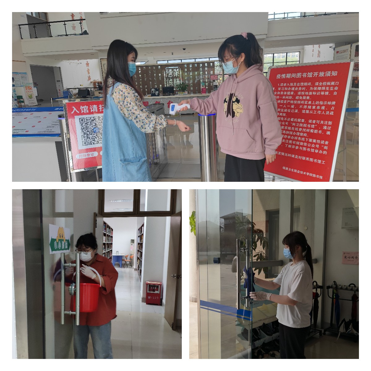 为确保图书馆安全有序开放,图书馆从细从严抓好各项防控措施——读者入馆需佩戴口罩、扫码核验健康码与行程码并测量体温、保持一米距离;图书馆入口、电梯、楼梯墙面张贴的疫情防控海报以及LED屏、微信公众号、网站等平台的宣教内容,提醒读者遵守防控规定,做好自我防护;馆内定时通风换气,阅览桌、地面每日清洁消毒,门把手、电梯按钮等公共接触部位每两小时消毒一次;图书馆入口处、电梯、洗手间配备洗手液,电子阅览室配备一次性手套,电脑和检索机覆盖键盘膜并每日消毒更换;读者翻阅、归还图书,经杀菌消毒后再上架;图书馆员们每一小时巡查一次书库、阅览室,发现读者未规范佩戴口罩、扎堆聚集等现象及时进行引导教育……