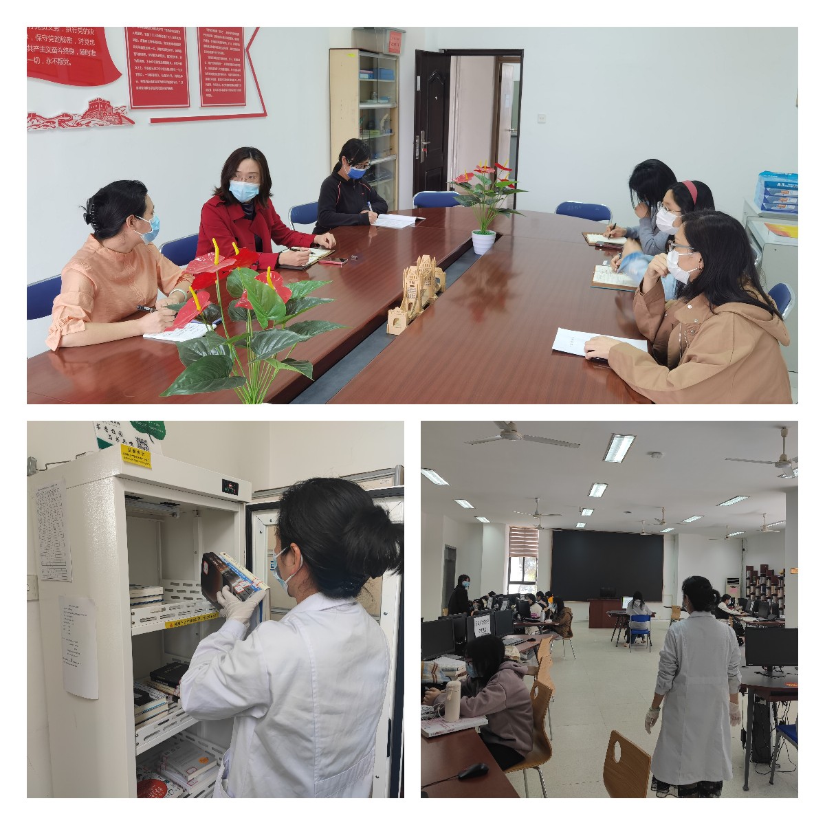 馆内开会制订防控细节、图书消毒、馆员巡库