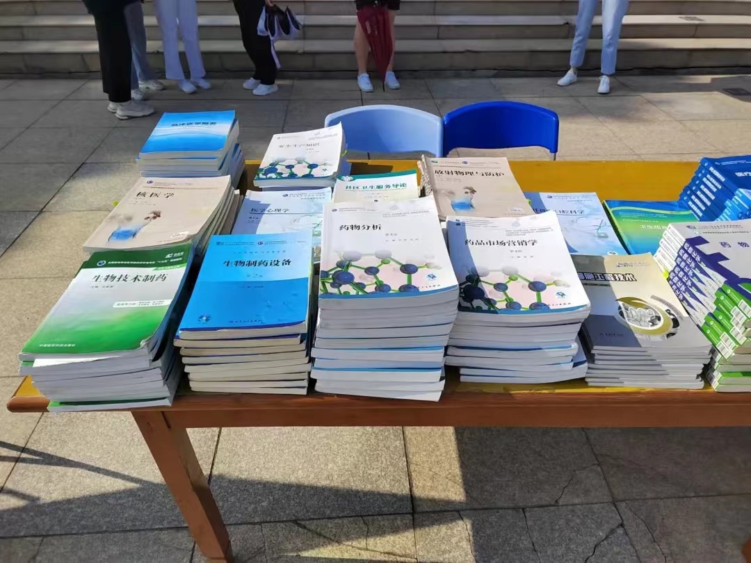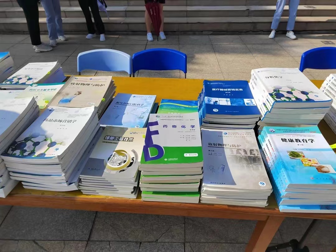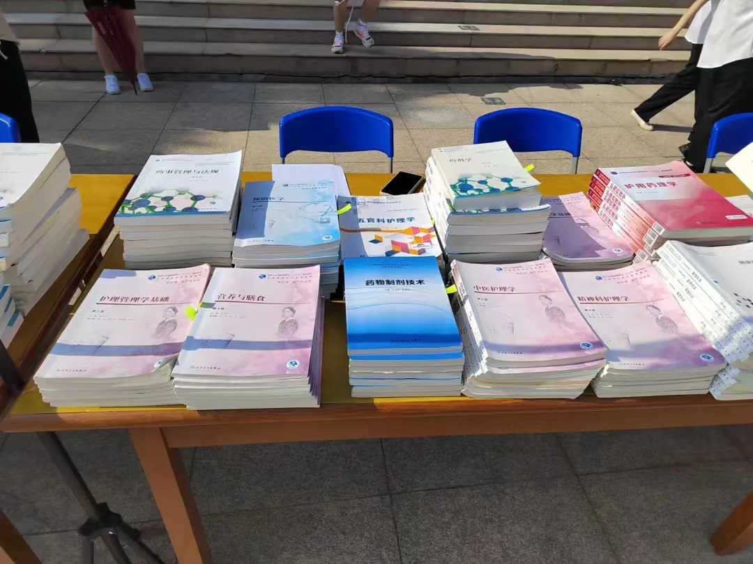 活动开始前,图书馆老师指导读者协会学生干部、志愿者布置活动现场,并提前将桌椅和旧教材等活动用品搬到图书馆前广场。活动当天可供免费领取的旧教材,均是在捐书活动中收到的捐赠旧教材。工作人员将旧教材按类整齐摆放,陈列了3张阅览桌。尚在筹备时段就吸引了许多学生驻足围观。