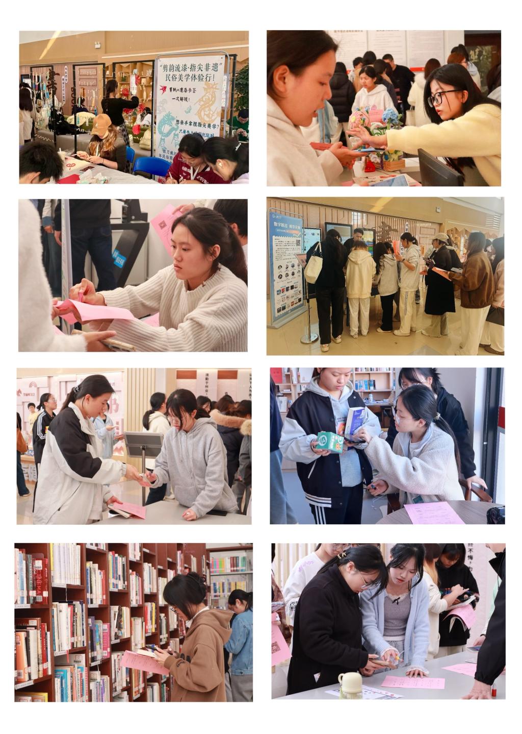 闭幕式当日,师生读者在会后移步臻善楼一楼大厅,参与图书馆同步开展的“阅见非遗·智享馆藏”馆藏文献与非遗文化推广活动。现场设置8个活动项目:“书香数智化·非遗永流传”微信扫码借书、阅读由你“点”读者荐书、掌上知网(中国知网)、关注万方(万方医学网)、指尖轻点(经纶知识服务)、悦读随行(中文在线)、深入人心(云图有声),另有“剪韵流漆·指尖非遗”民俗美学体验互动。师生们在文献展陈里触摸文化脉络,在非遗体验中感受传统温度,于沉浸式互动里延续书香意趣。这场将阅读推广与校园文化建设深度融合的实践,也为本届读书文化节添上了生动注脚。