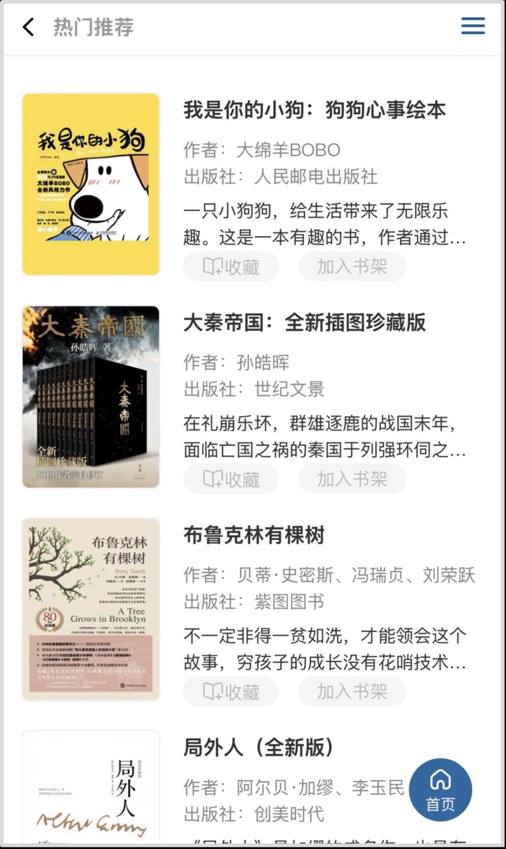 除经典典籍图书以外,平台紧跟社会热点与大众阅读趋势,收录畅销文学作品、影视原著、新书速递、豆瓣好书等。