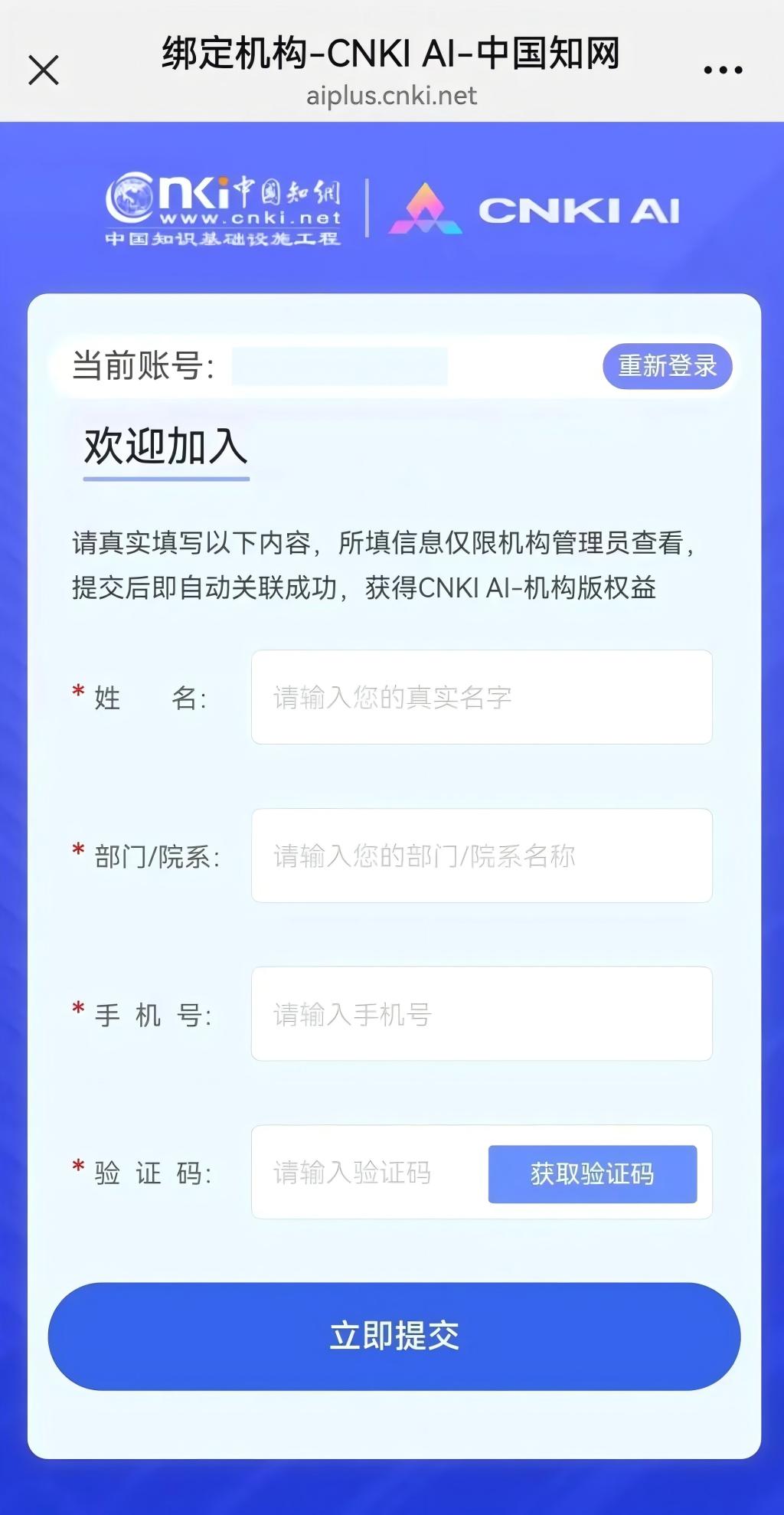 填写姓名、部门/院系、手机号相关字段,点击“立即提交”。绑定成功后界面会显示“绑定成功”。