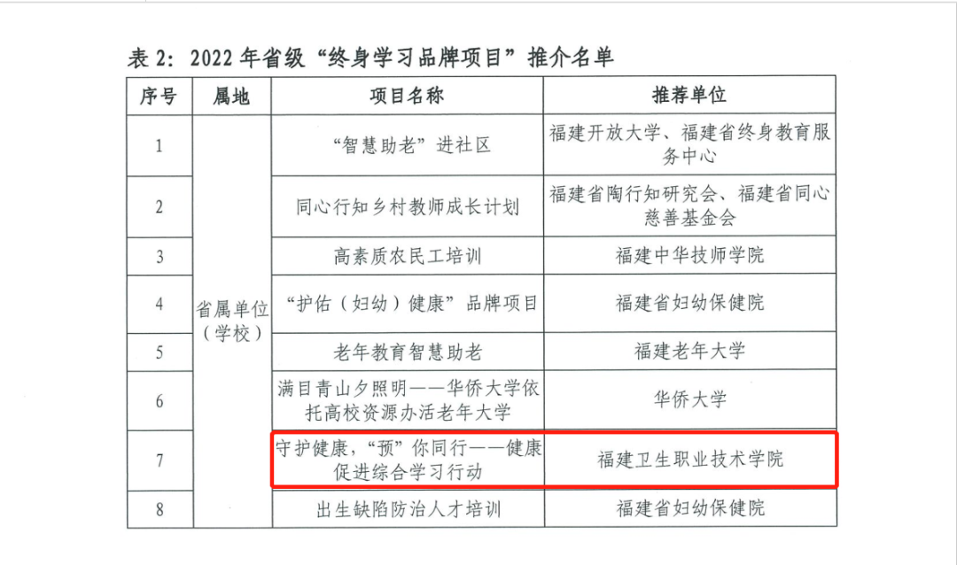 “终身学习品牌项目”是教育部全民终身学习活动周的重要内容,也是福建省营造终身学习氛围、建设学习型城市的重要体现。活动旨在为助力构建服务全民终身学习教育体系、加快建设学习型社会、大力提高国民素质提供示范引领的典型。经过专家综合评议,全省共评选出“终身学习品牌项目”42个,“百姓学习之星”58个。