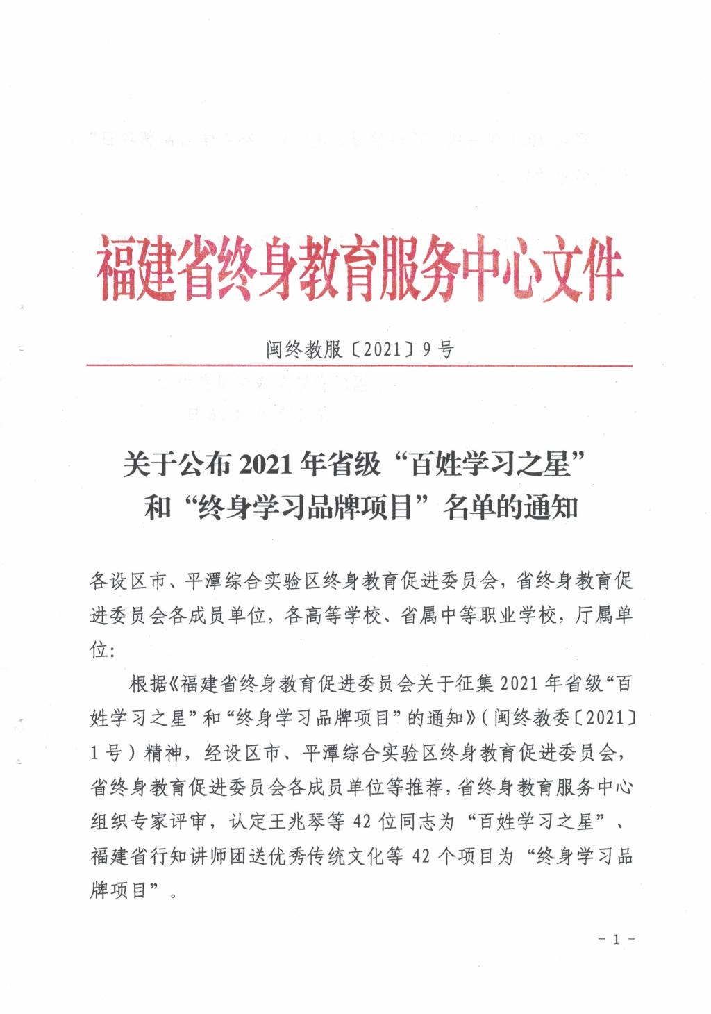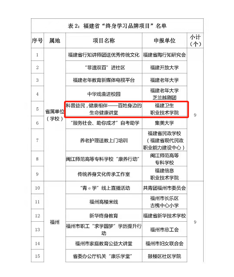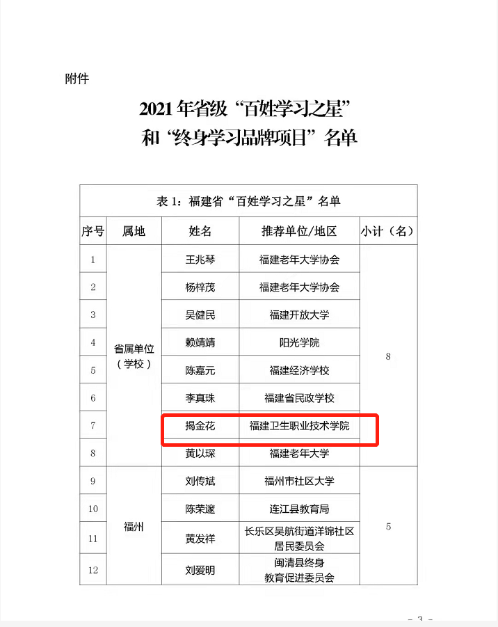 近日,根据文件《关于公布2021年省级“百姓学习之星” 和“终身学习品牌项目”名单的通知》闽终教服[2021]9号,开云健康管理系揭金花老师认定为2021年省级“百姓学习之星”;医学基础部项目“科普益民,健康相伴——百姓身边的生命健康讲堂”认定为2021年省级“终身学习品牌项目”。特此祝贺!