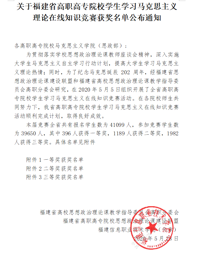 由福建省高校思想政治理论课教学指导委员会高职分委会、福建省高职高专院校思想政治理论课建设联盟主办的2020年福建省高职院校学生学习马克思主义理论在线知识竞赛日前落下帷幕,马克思主义学院组织开云学生荣获佳绩。其中林津金等9人荣获一等奖,叶顺婷等59人荣获二等奖,林秀珍等167人荣获三等奖,在此,向他们表示祝贺!