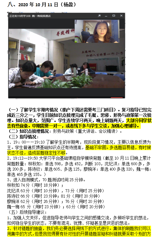 会根据学生的上课、实训、见习等多方面因素制定集训计划,利用易班大学习平台和学习通两大线上平台开展针对性测验,检验学习成果,测试结束后针对错题进行分析讲解,进一步巩固知识点,并引导学生收集整理错题集。同时指导老师还根据辅导情况,制作指导手册,每天动态跟踪记录学生的学习情况,实时调整集训强度和进度。除此之外,指导老师分别与选手结对开展线下针对性指导,针对每个学生的知识储备情况和薄弱点,分析学生学习特点,因材施教。