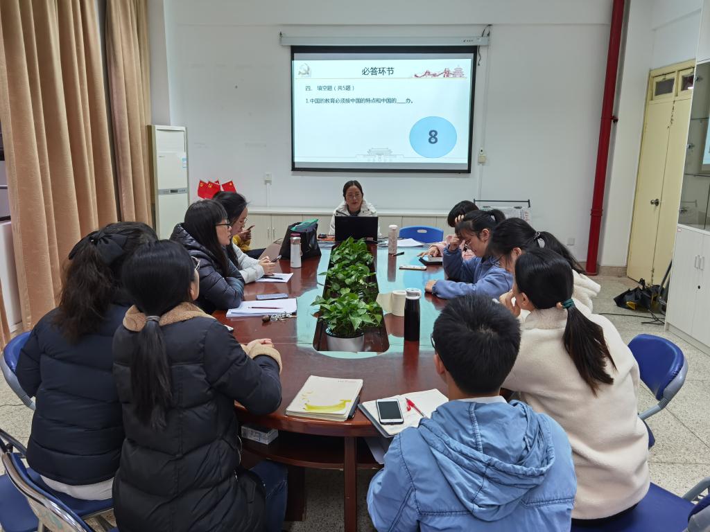 则、赛事安排、对手分析等现场知识竞赛注意事项的详细讲解,播放往年的现场比赛视频,在观摩过程中注重让学生观察与分析,掌握现场竞赛要点和往年竞赛题库。决赛前,开展系列现场模拟赛,邀请全体马院教师现场观赛,赛后针对模拟赛现场情况、参赛选手问题、后续集训方案等多个方面展开专题讨论。集合教师意见,有针对性的调整指导方案。