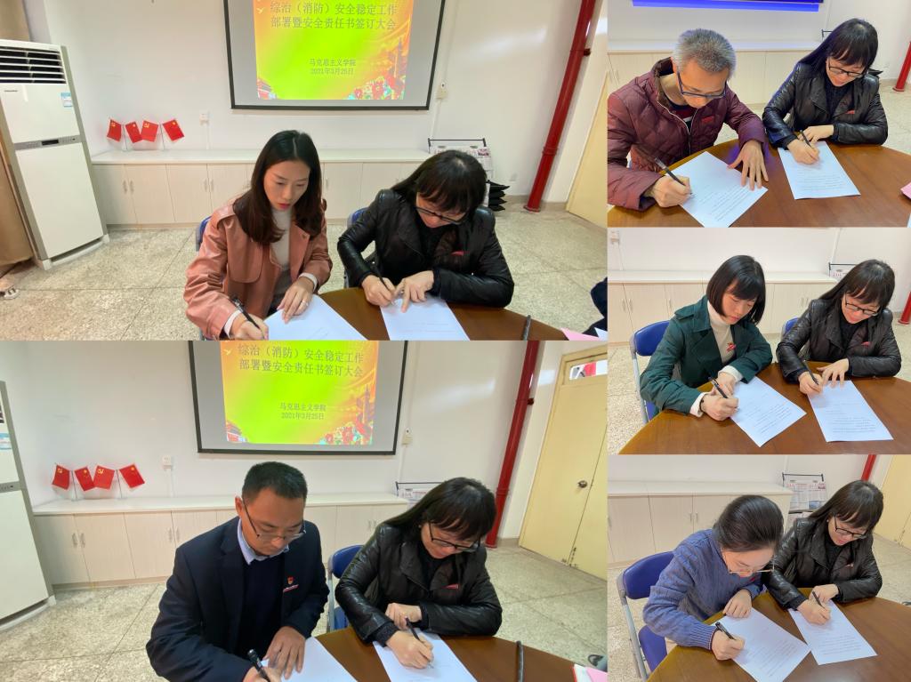 为贯彻落实学校关于(综治)消防安全稳定工作精神,进一步加强校园安全防范工作,切实保障全体师生的安全和校园稳定和谐。2021年3月25日上午,马克思主义学院在会议室107召开(综治)消防安全稳定工作部署暨安全责任书签订大会。会议由马克思主义学院院长熊美兰主持,马克思主义学院全体教师参加此次会议。