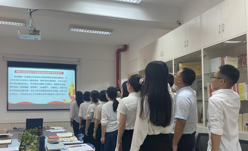 熊美兰作为领誓人,带领全体思政老师重温思政课教师职业誓词,郑重承诺担负好新时代思政课教师的光荣职责和使命抱负。