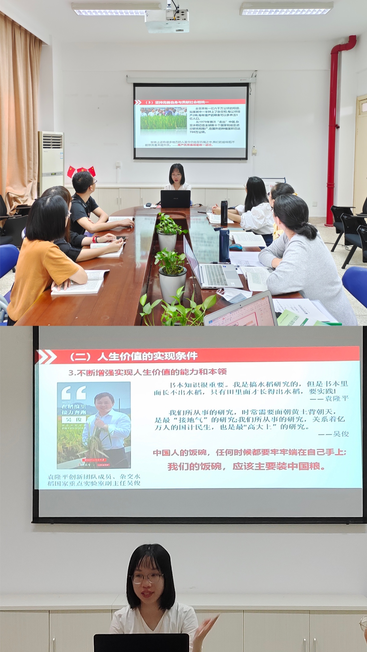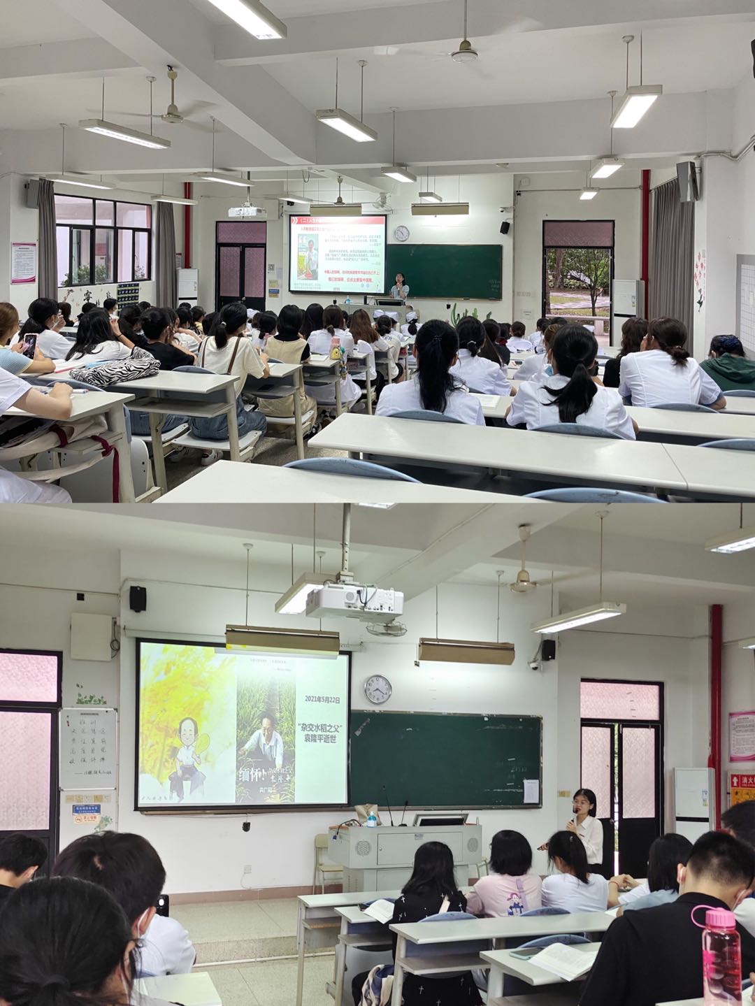 课堂上,任课教师向学生介绍袁隆平院士的事迹。袁隆平将让“所有人远离饥饿”作为毕生追求。同时,课堂结合袁隆平“禾下乘凉梦、杂交水稻覆盖全球梦”,引导学生“中国人的饭碗,要牢牢掌握到自己手上去”,同学们深受袁隆平事迹的感动。通过此次教学引导,学生深刻认识粮食来之不易以及粮食安全的重要性。课堂上,任教老师还讲授了生态文明、绿色发展理念的相关知识,引导学生认识和理解绿色发展,争做具有生态文明价值观的医药卫生人才。
