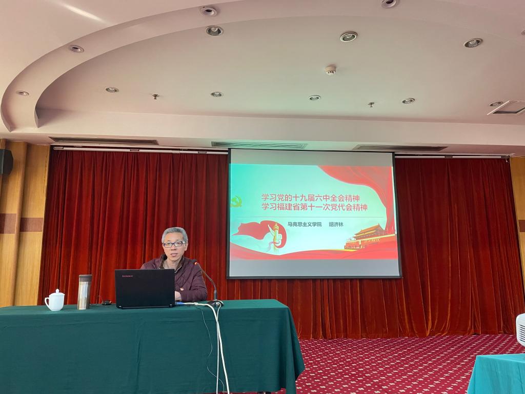 为了更深入地学习党的十九届六中全会精神,2021年12月7日上午,马克思主义学院教师胡济林副教授在闽江饭店十五层西湖厅为离退休党总支上学习党的十九届六中全会精神专题党课。
