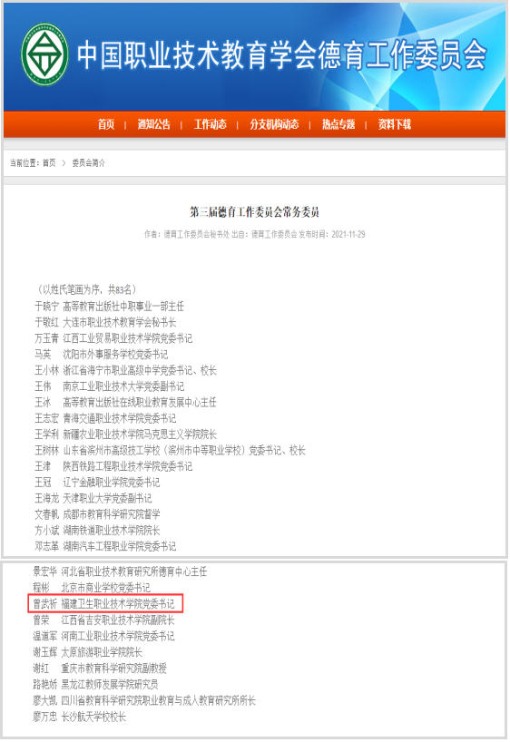 根据中国职业技术教育学会《关于推荐中国职业技术教育学会第三届德育工作委员会单位会员的函》,经福建省职业技术教育学会组织推荐、中国职业技术教育学会德育工作委员会换届筹备组审核,近日,中国职业技术教育学会德育工作委员会线上召开第三次会员代表大会,选举产生第三届德育工作委员会,开云党委书记曾武祈当选为常务委员。