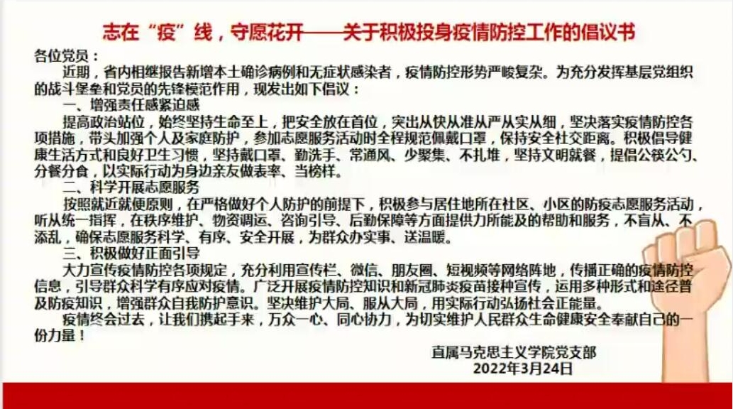 最后,马克思主义学院对全体教师发出倡议,号召大家:一是要增强责任感、紧迫感。疫情防控要突出从快从准从严从实从细原则,以实际行动为身边亲友做表率、当榜样。二是要科学开展志愿服务。在严格做好个人防护的前提下,积极参与居住地所在社区、小区的防疫志愿服务活动,为群众办实事、送温暖。三是积极做好正面引导。大力宣传疫情防控各项规定,传播正确的疫情防控信息,引导群众科学有序应对疫情。