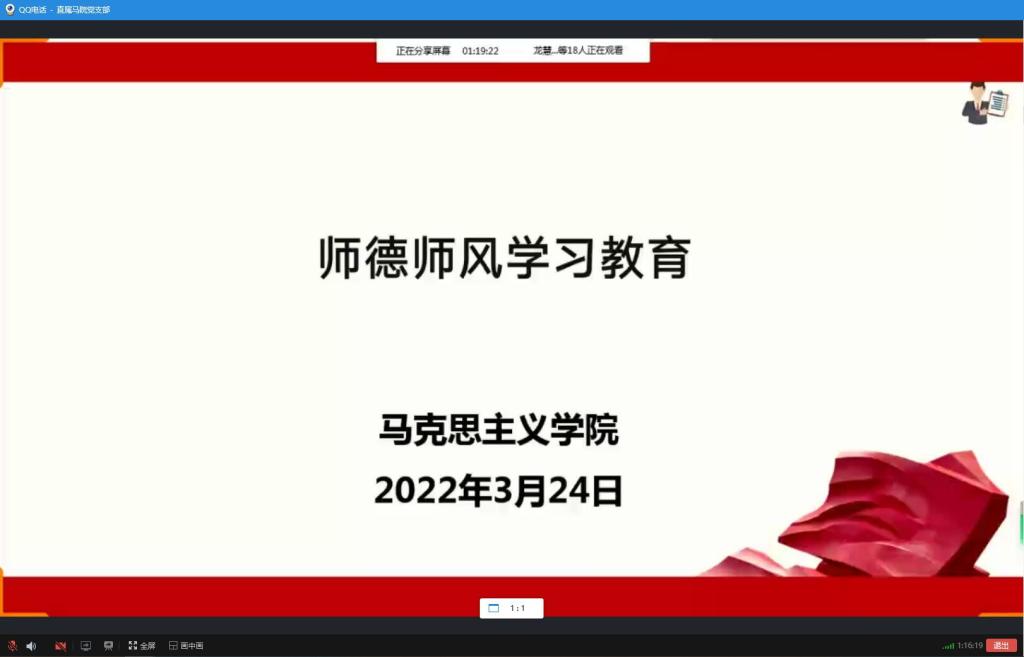 近期学校周边出现了本土聚集性疫情,为强化思想引领,让疫情防控成为师德培育的大课堂,2022年3月24日,马克思主义学院在线上开展师德师风专题学习,本次学习活动由马克思主义学院院长熊美兰主持,马克思主义学院全体教师出席本次活动。