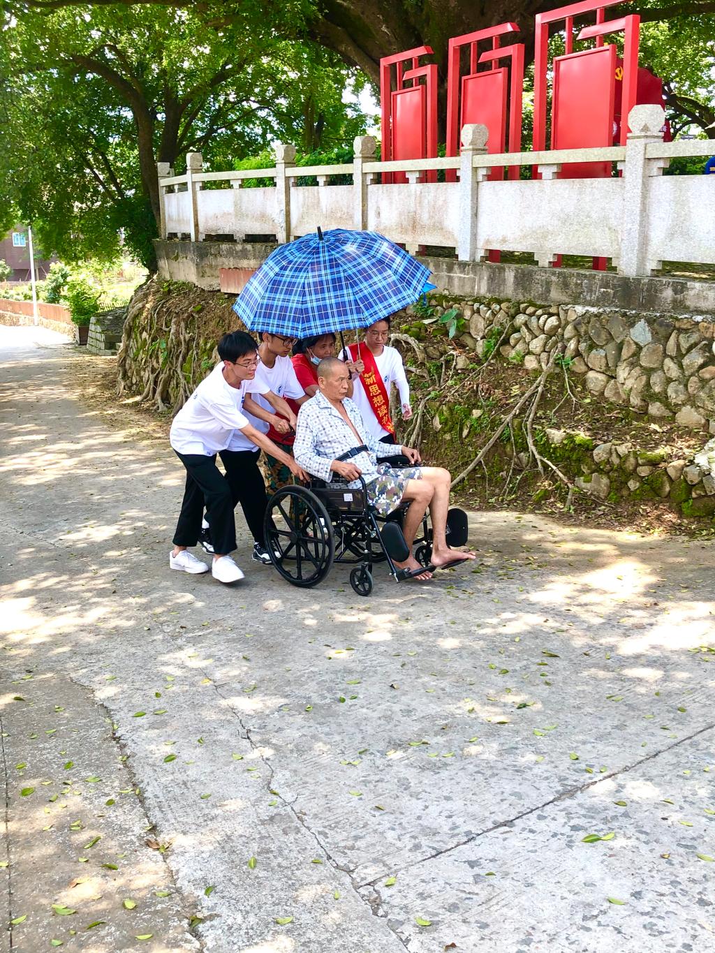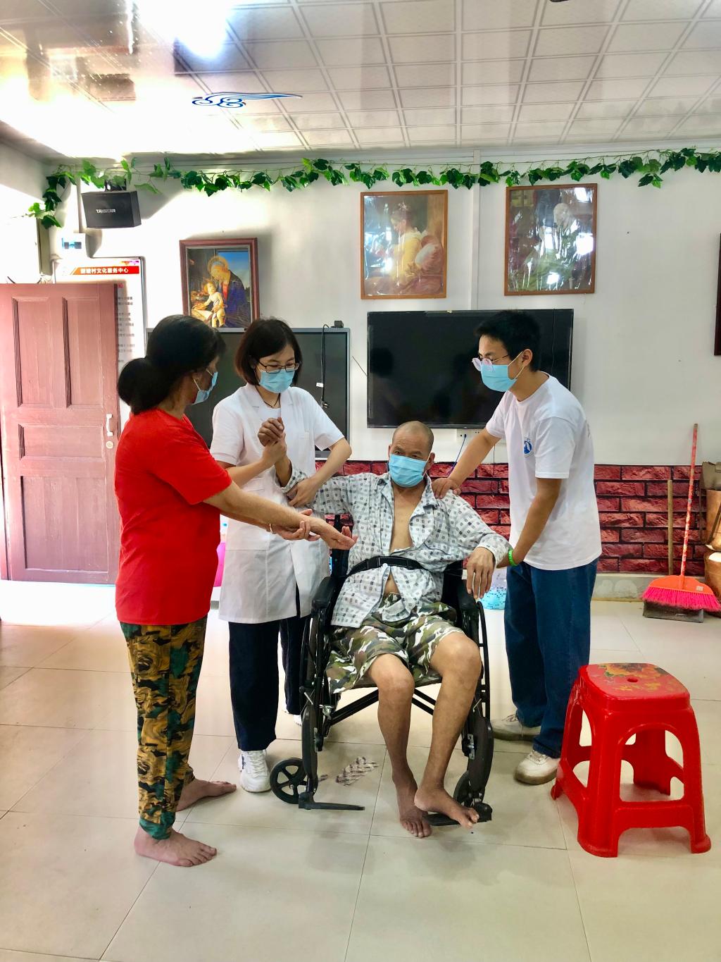 期间我们遇见了一位村民阿姨,在自己接受推拿、拔罐等服务后,觉得很满意。她向我们讲述了她的困难,她的爱人因手术后瘫痪在床,平日里靠她进行照顾,由于乡村医疗、交通条件限制,老人无法定时去医院接受康复治疗,希望我们能够为她的老公做一些康复医疗服务。听闻了这件事,“马上逐梦队”队员就自发要去帮助这名患者,几位同学同村民阿姨一起将其老公用轮椅推到位于半山腰上的村部。徐丽莺老师为其进行了肢体的被动活动和四肢牵伸,并对她进行了康复医疗知识的指导。两位老人表示非常感谢“马上逐梦队”为他们提供的帮助。