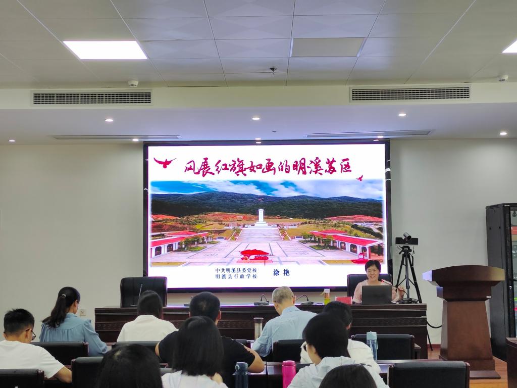“宁化、清流、归化,路隘林深苔滑。今日向何方,直指武夷山下。山下山下,风展红旗如画。”一首毛泽东同志的《如梦令·元旦》让教师们重回革命战争年代如火如荼的斗争场景,重温革命先烈用鲜血和生命铸就的苏区精神。在理论教学环节中,明溪县委党校高级讲师涂艳为教师作《风展红旗如画的明溪苏区》专题讲座。她从“路隘林深苔滑——血与火的革命实践”“风展红旗如画——谱写时代的新篇章”两部分为教师们上了一堂生动的党史思政课。
