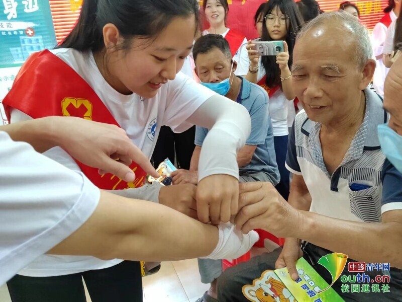 图为马上逐梦队队员们现场教学包扎方法。中国青年网通讯员 邱炜靖 供图