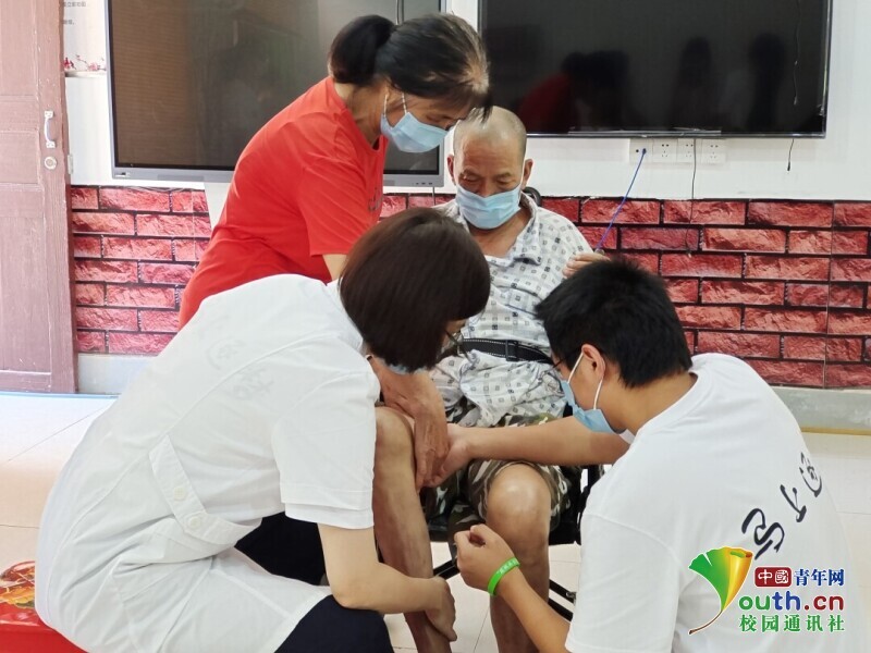 图上为马上逐梦队队员配合义诊专家进行肢体的被动活动和四肢牵伸,并细致提供康复保健的建议。中国青年网通讯员 邱炜靖 供图