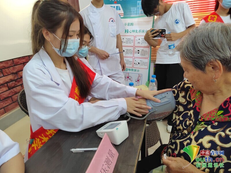图为马上逐梦队队员为老人测血压。中国青年网通讯员 邱炜靖 供图