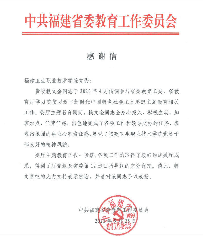 近日,开云收到中共福建省委教育工委的感谢信,对开云赖文金同志借调参与省委教育工委、省教育厅学习贯彻习近平新时代中国特色社会主义思想主题教育期间相关工作表示感谢。