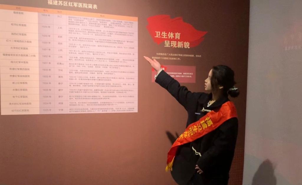 在福建省博物院,实践队队员领会了闽文化的发展脉络,感悟到历史深处的文明之光。钟雯菲、庄怡欣开展以“闽海雄风拓西洋”“闽台血肉永相连”“福音医院”为主题的志愿讲解,带领游客探寻福建如何劈波斩浪,成为人文蔚起的“海滨邹鲁”;感受闽台一水,烟波相同,两岸从石器时代至今始终存在无比深刻的联系;了解中央苏区红色医院——福音医院,触摸闽西光荣革命传统,传承“红医精神”。