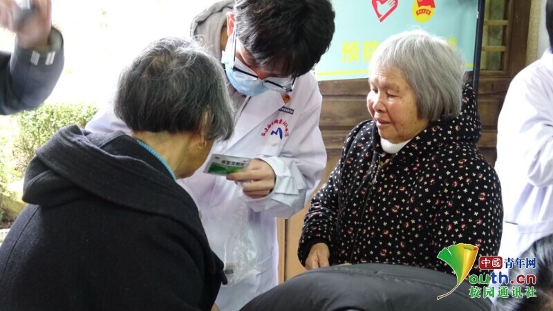 图为“医脉相承队”队员为村民分发感冒药,并告知其注意事项。中国青年网通讯员 陈惜如 供图