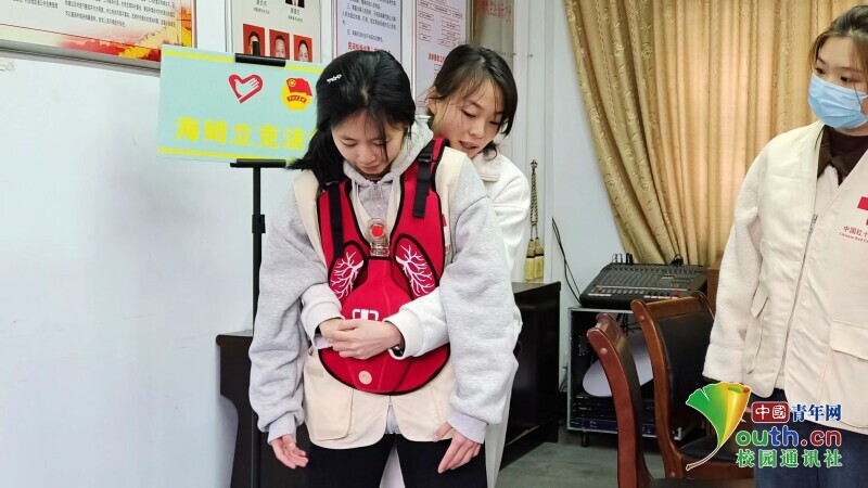 图为“医脉相承队”队员为村民进行海姆立克急救法教学。中国青年网通讯员 陈惜如 供图