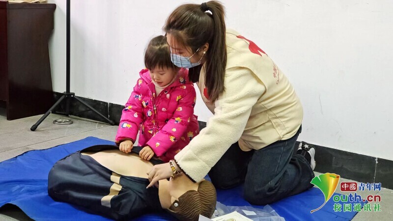 图为“医脉相承队”队员为小朋友进行CPR教学。中国青年网通讯员 陈惜如 供图