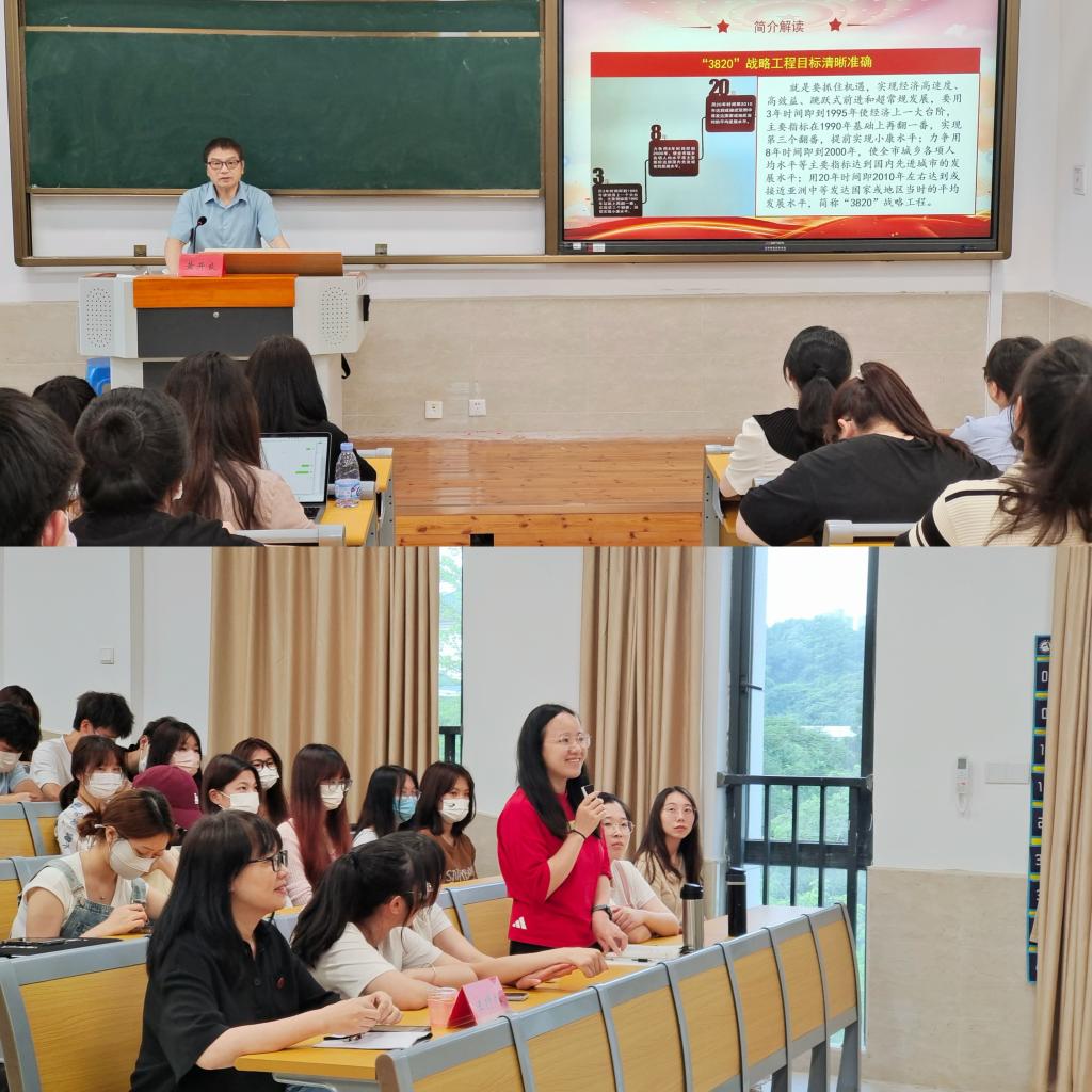 时任福州市委书记习近平同志亲自担任总指导和主编,制定了《福州市经济社会发展战略设想》(简称“3820”战略工程)。黄开良在福州市委办公厅工作期间,作为编辑和责任编辑全程参与了这项工作。他以亲身经历为线索,用一张张真实照片、一本本工作笔记、一页页批示带领与会师生重温习近平总书记在福州工作期间谋划实施“3820”战略工程、推动福州跨越发展的重要理念和重大实践,并与在场师生进行亲切交流、热情互动。