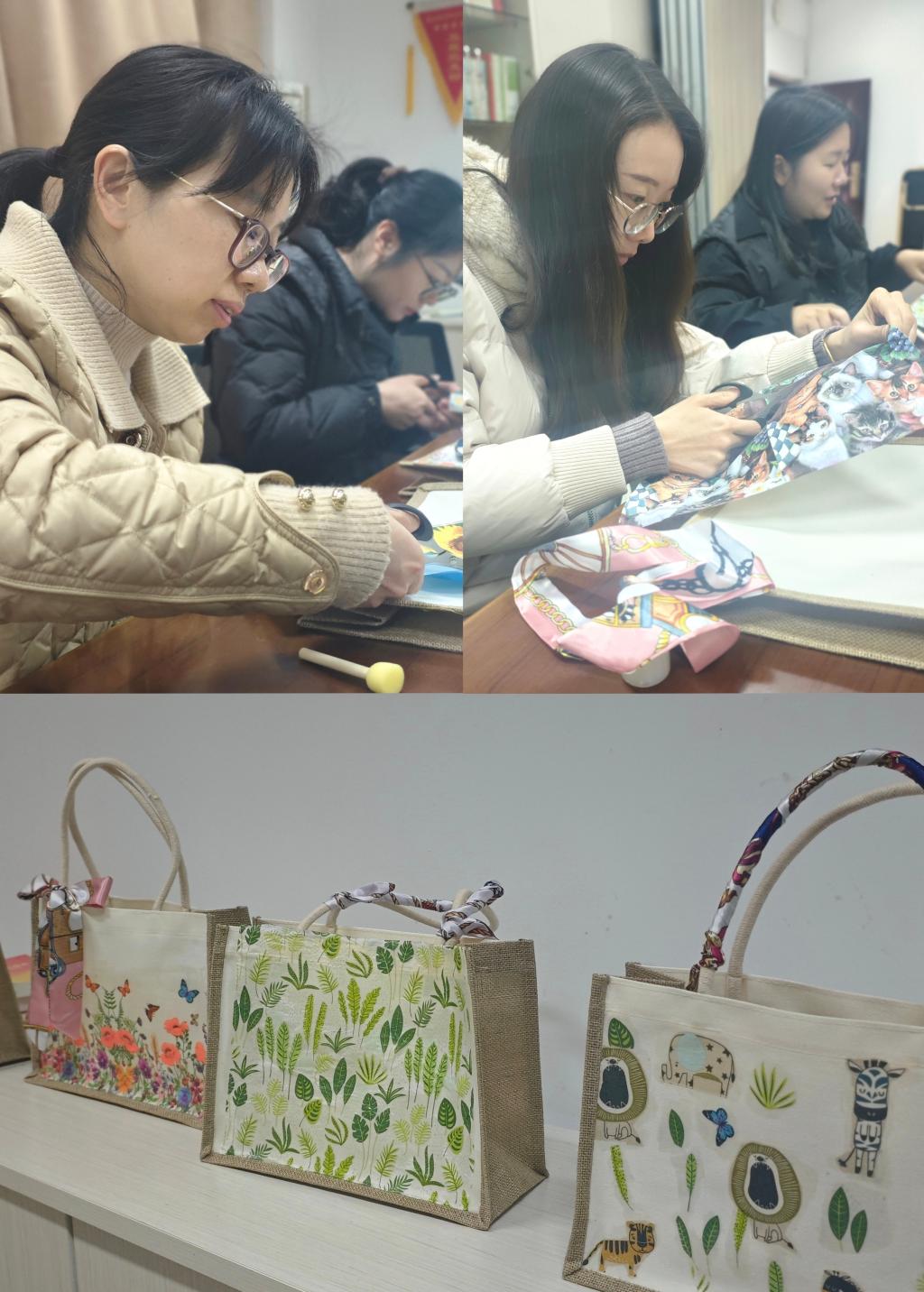 活动现场气氛热烈,欢声笑语不断,大家纷纷拿起画笔、剪刀和胶水,将五彩斑斓的图案精心地拼贴在帆布包上,创作出独一无二的艺术作品。