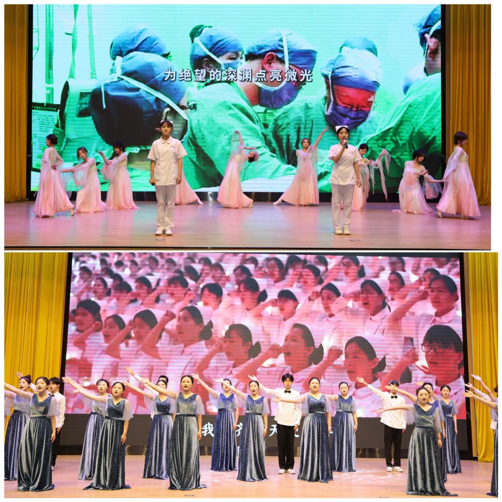 歌伴舞《如您所愿》以悠扬旋律将新时代青年对闽籍医学先辈的追思与传承之志娓娓道来,舞者舒展的身姿与饱含深情的歌声交织,传递出新时代青年对先辈的追思与传承之志。随后,全体师生起立齐唱校歌《仁心如花》,“仁心如花,绽放芳华,守护生命,不负韶华”的歌词回荡在报告厅内,既是对红医精神的生动诠释,更是对青年学子的殷切期许。