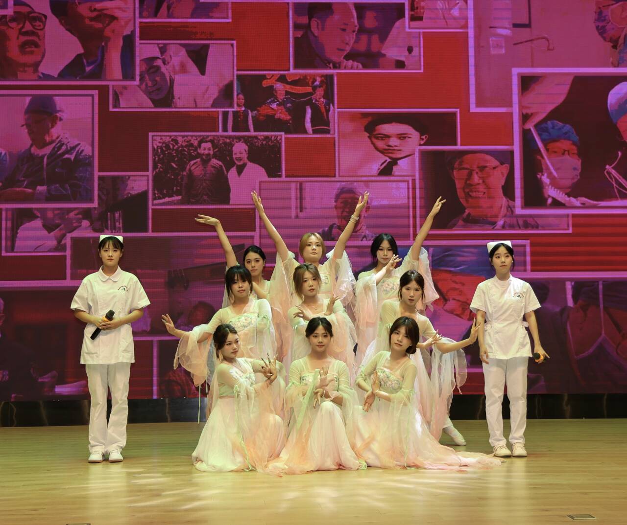随后,伴随着“而我将敬你所敬的誓言,守你所守的信念,你的手我蹒跚在牵,请带我去明天……”的动人旋律,青年学子以《如您所愿》《仁心如花》等文艺节目为依托,通过歌伴舞、朗诵、合唱等形式,向革命先驱献上最深情的礼赞与最崇高的致敬。激昂的朗诵与深情的歌舞交相辉映,字里行间的铮铮誓言镌刻着使命担当,生动传递出年轻一代铭记历史、不负嘱托的坚定信念。