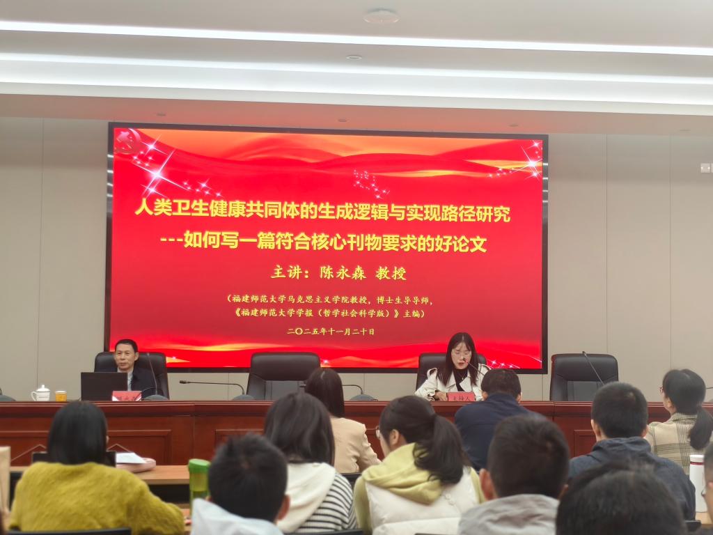 为精准传递科研价值、系统提升教师学术写作能力、凸显研究创新特质、规范科研成果呈现。11月20日,马克思主义学院邀请福建师范大学马克思主义学院教授、博士生导师,《福建师范大学学报(哲学社会科学版)》主编陈永森在厚德楼六楼会议室开展《人类卫生健康共同体的生成逻辑与实现路径研究——如何写一篇符合核心刊物要求的好论文》的专题讲座。马克思主义学院副院长杨盈主持,马克思主义学院全体专兼课教师参加。
