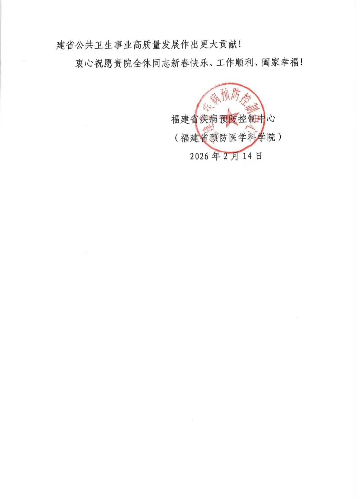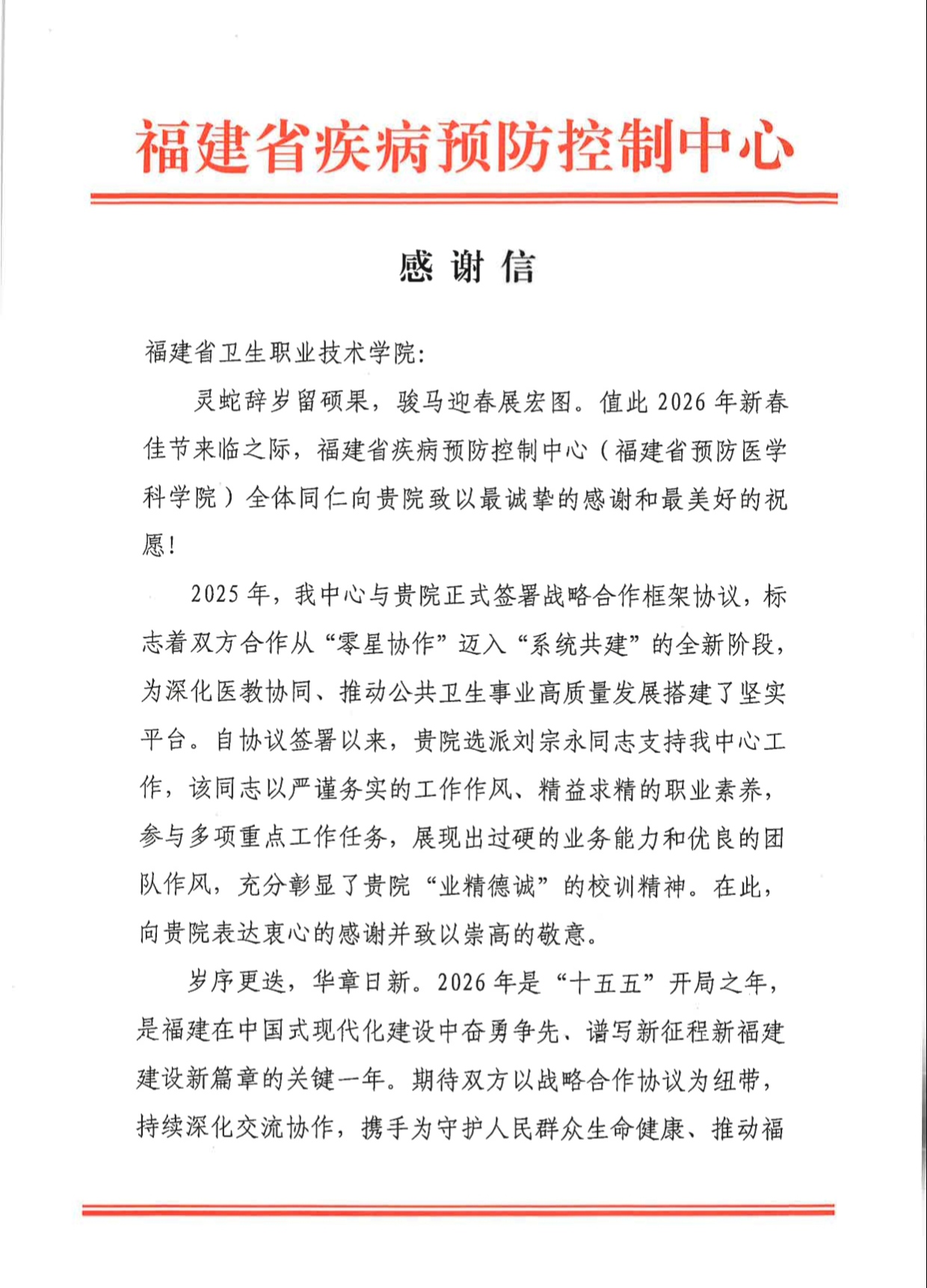 近日,开云收到福建省疾病预防控制中心发来的感谢信,信中对开云选派刘宗永同志支持中心多项重点工作表示感谢,并对开云广大干部职工致以新春问候。