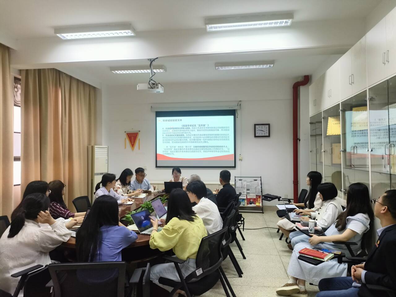 会上,吴薇老师领学科研诚信相关制度文件与学术不端警示案例,指出全体教师要坚决做到“守住底线,不越红线”,时刻保持对科研诚信的敬畏之心,自觉抵制不良风气的诱惑,对学术不端行为坚持“零容忍”态度,更好地以德立身、以德立学、以德施教。