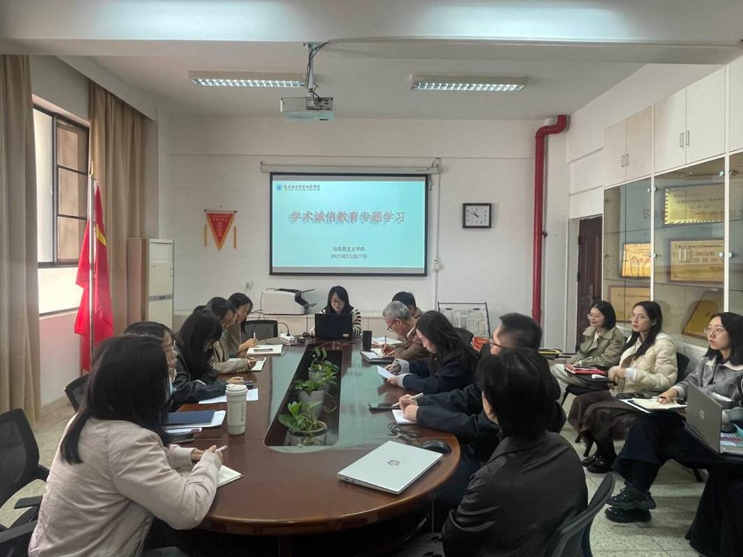 为深入贯彻落实立德树人根本任务,弘扬求真务实的学术精神,营造风清气正的学术环境,2025年11月27日,马克思主义学院在厚德楼106会议室开展学术诚信教育专题学习活动。活动由马克思主义学院院长熊美兰主持,马克思主义学院全体教师出席本次活动。