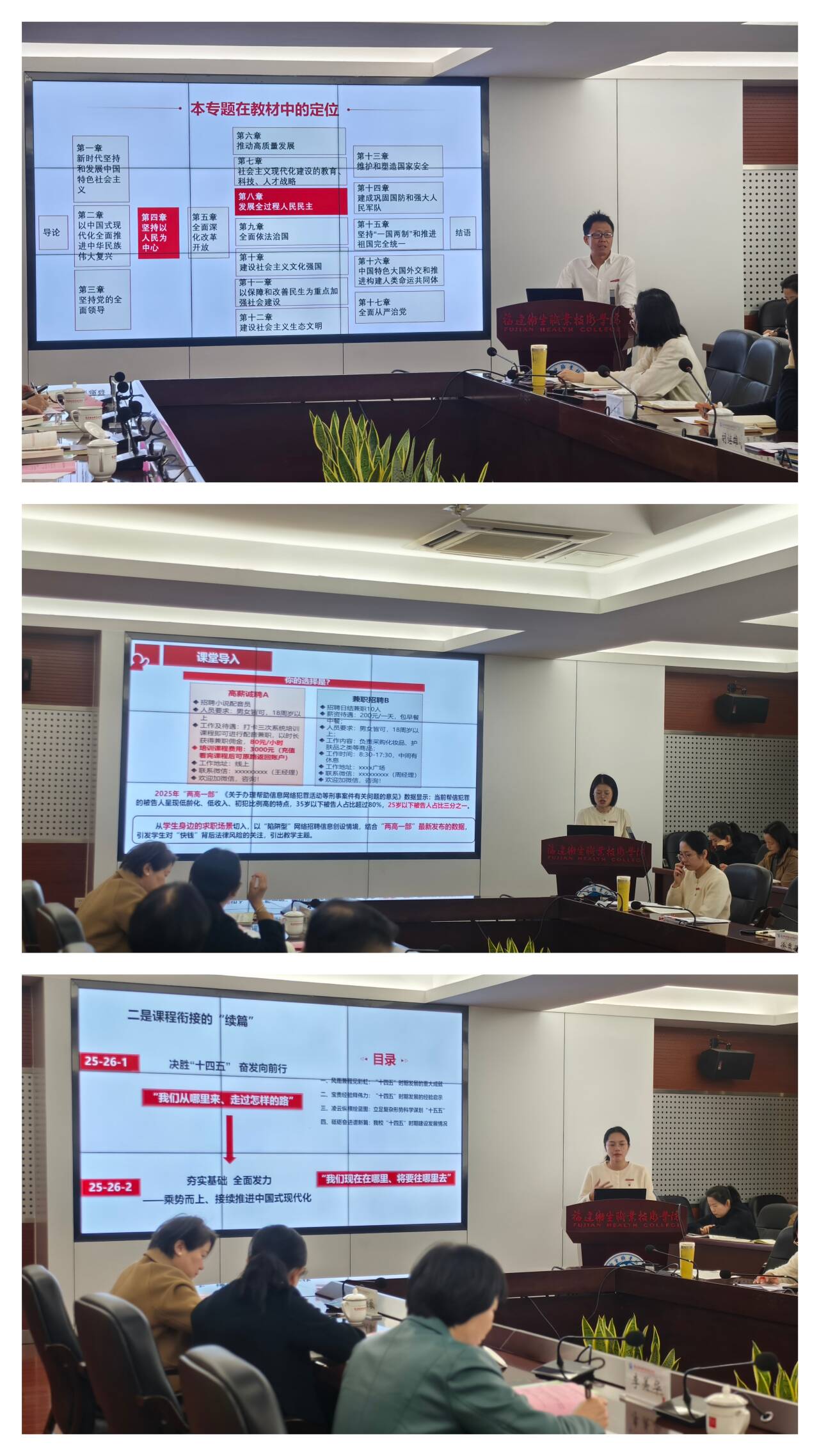 集备会上,开云张天文老师围绕《习近平新时代中国特色社会主义思想概论》专题四“新时代中国特色社会主义政治建设——价值旨归与民主实践”展开集备;罗芸老师聚焦《思想道德与法治》专题七“学习法治思想提升法治素养”进行展示;张茵珠老师围绕《形势与政策》专题一“夯实基础 全面发力——乘势而上、持续推进中国式现代化”进行集备。三位教师凝心聚力、各展所长,以精准定位锚定方向,以科学设计搭建框架,以优质内容筑牢根基,以创新手段赋能课堂,系统梳理教学逻辑,精准突破重难点,精选福建地域特色与校本化素材,有机融入信息化教学技术,对接学校事业发展方向,将宏大叙事转化为青年学生可感可知、可行可践的成长指南。